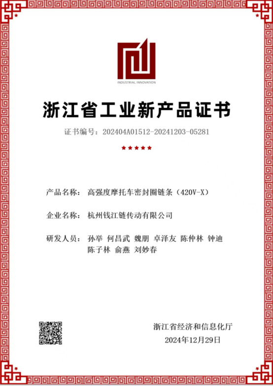 Hoge sterkte olie-afgedichte motorfietsketting model 420V-O(X), ontwikkeld en geproduceerd door Hangzhou Qianjiang Chain Industries Co., Ltd. voldoet aan de certificering voor nieuwe producten op provinciaal niveau