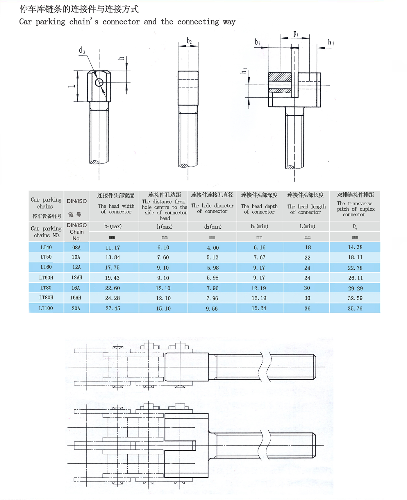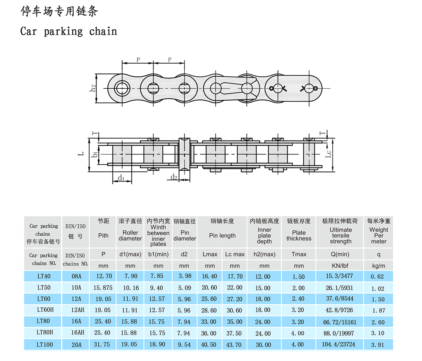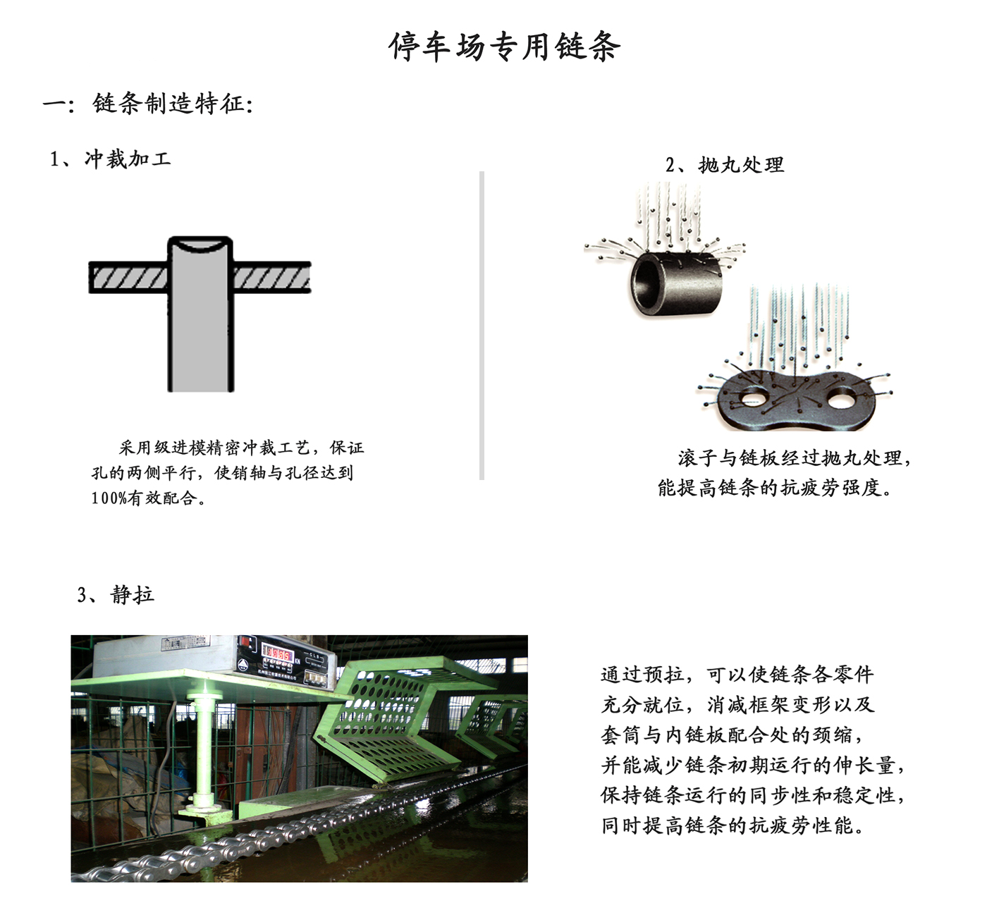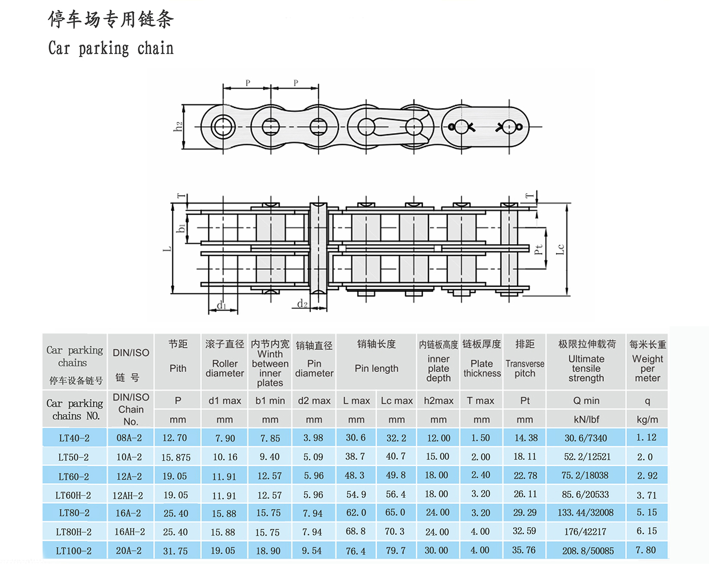 De keten van de intelligente driedimensionale parkeerapparatuur is de tweede fase transmissie van het hoofdgedeelte van de parkeerapparatuur. De implementatiestandaard is JB/T11079-2011. De gebruikskenmerken van de ketting: groot draagvermogen, hoge treksterkte (statische sterkte), de minimale treksterkte is 10% -30% hoger dan die van gewone precisierollenkettingen, de index van vervorming, nauwkeurigheid van de kettinglengte, weerstand tegen vermoeidheid enz. zijn ook hoger dan die van gewone precisierollenkettingen.