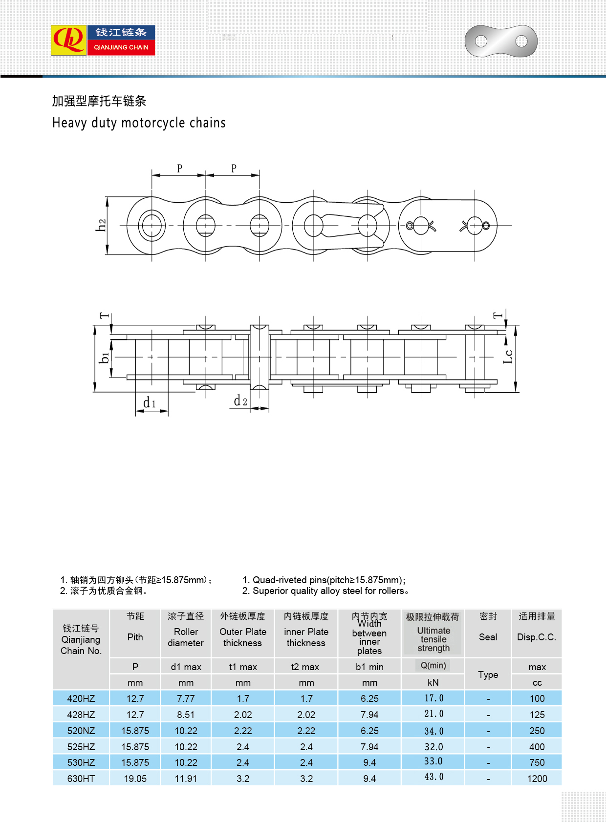 Hoge kwaliteit gelegeerd staal, sterke heavy-duty motorfietskettingen - ontworpen voor ongeëvenaarde prestaties en betrouwbaarheid. Deze kettingen zijn gemaakt van hoogwaardig gelegeerd staal en zijn gebouwd om de omstandigheden te weerstaan en bieden sterkte, slijtvastheid en langdurige duurzaamheid.